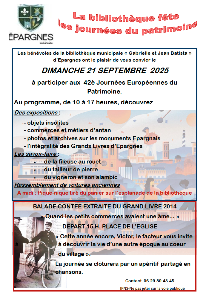Dimanche 21 septembre 2025, la bibliothèque municipale « Gabrielle et Jean Batista » vous invite à découvrir le patrimoine d’Épargnes.