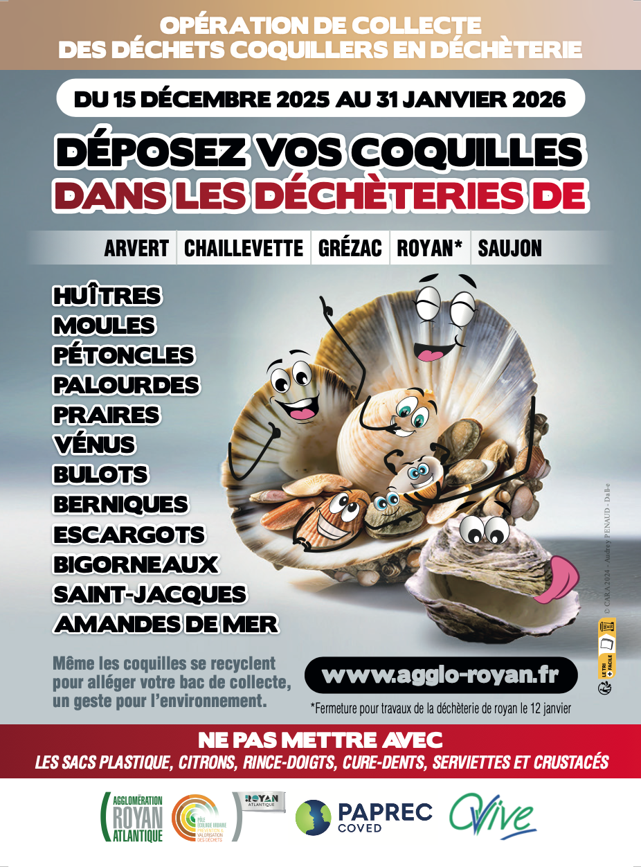 Du lundi 15 décembre jusqu'au samedi 31 janvier 2026, les coquilles d'huîtres, moules, pétoncles, Saint-Jacques, palourdes, praires, bulots, berniques ou bigorneaux pourront ainsi être déposés dans les déchèteries d'Arvert, Chaillevette, Grézac, Royan et Saujon.