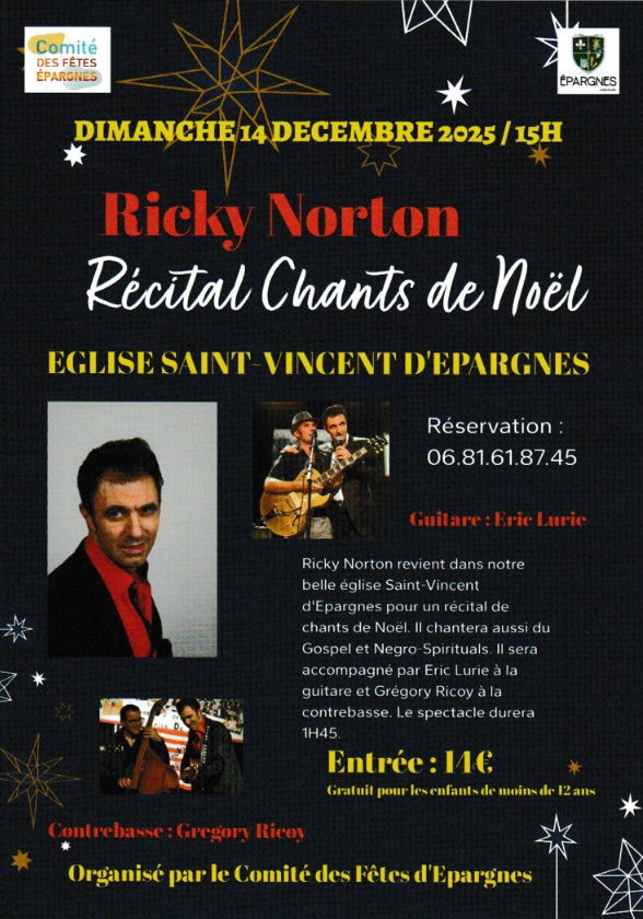 "chants de Noël" par Ricky Norton dans l'église d'Epargnes le 14 décembre à 15h.